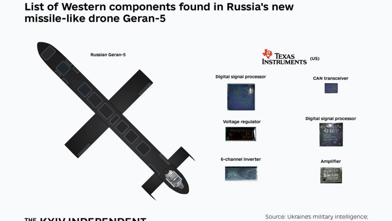 La página del Geran-5 lista componentes y fabricantes que, según la inteligencia ucraniana, fueron identificados a partir de materiales analizados.