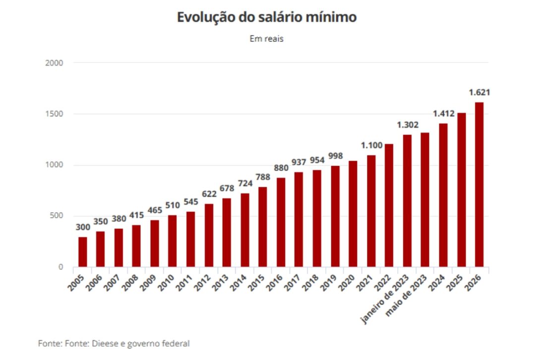 El salario mínimo de R$ 1.621 ya está en vigor desde 1 de enero, con un reajuste de 6,79% sobre los R$ 1.518 anteriores. El cambio afecta salarios y beneficios que utilizan el mínimo como referencia.