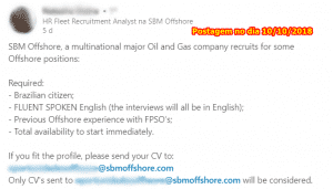 Interesados en las oportunidades de SBM Offshore, por favor, envíen sus currículos al e-mail oportunidadesoffshore@sbmoffshore.com, informando en el título del mensaje en inglés cuál es el cargo al que se están postulando, ejemplo: «Crane Operator – 3 years FPSO experience – Macaé City». No se especificaron cargos, pero si ustedes quieren saber cuáles son los tipos de profesionales que normalmente son contratados para este tipo de unidad, hagan clic aquí, aprovechen y echen un vistazo a algunos cursos relacionados con su área de actuación. Confirmen a continuación la publicación oficial de Recursos Humanos de SBM Offshore: