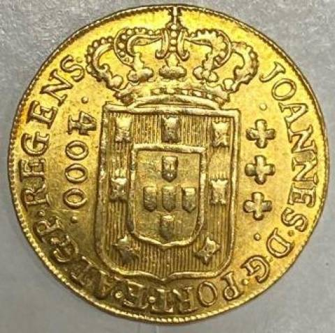 Producida por la Casa de la Moneda de Minas Gerais, la moneda de 4.000 réis también es una de las piezas históricas más valiosas de Brasil. Las ediciones de esta moneda varían entre los valores de R$ 270 mil, para la edición de 1727, y hasta R$ 330 mil, en el caso de una moneda de 1724.