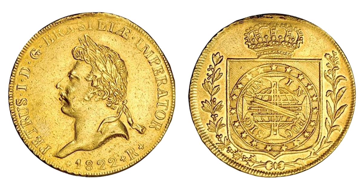 La moneda de 6.400 réis es considerada la pieza más valiosa jamás acuñada en Brasil. Producida en 1822 para celebrar la coronación de D. Pedro I, esta moneda rara lleva una historia singular: el propio emperador no aprobó el resultado final de la pieza. La moneda no fue producida a gran escala, lo que contribuye a su rareza.