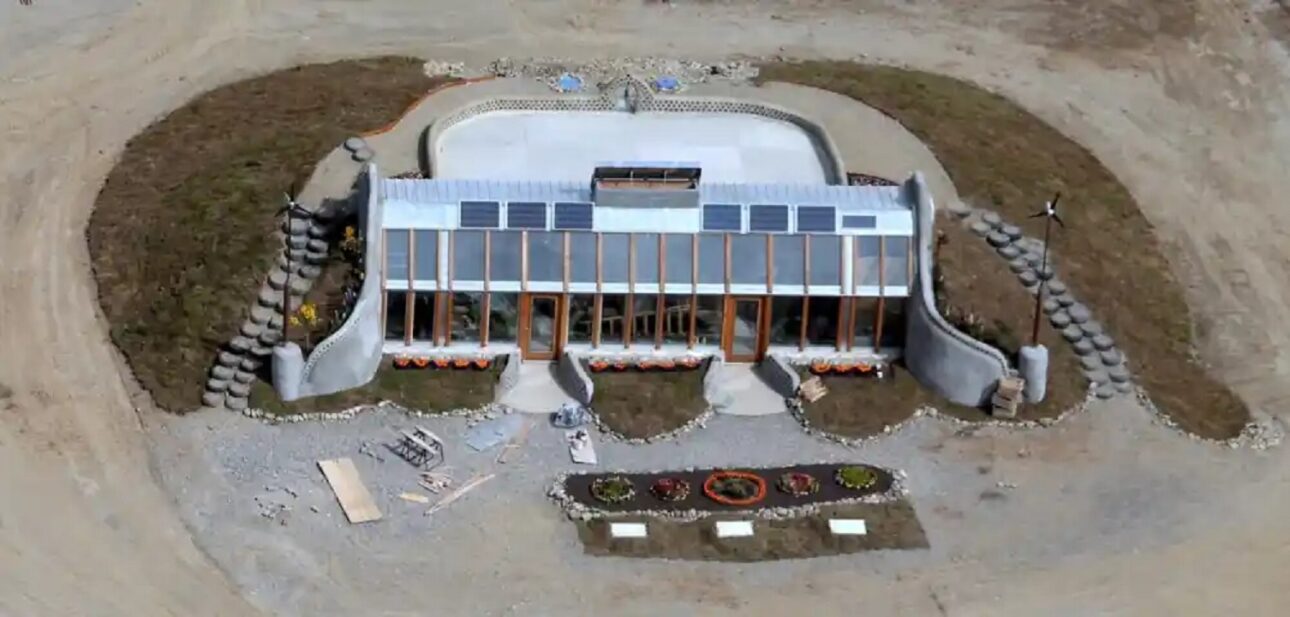 La técnica utilizada en la construcción se llama Earthship Biotecture y fue desarrollada por el arquitecto estadounidense Michael Reynolds desde los años 1970, en el desierto de Nuevo México. La idea central es tan simple que parece improvisada: tomar neumáticos desechados, llenarlos con tierra húmeda a golpes de mazo hasta que queden completamente compactados y apilarlos en capas para formar las paredes estructurales del edificio.