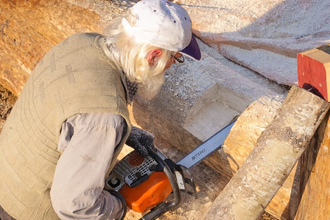 Cuando los troncos entran, la obra cambia de escala. La madera es el material principal, pesado, con superficie irregular, y pide corte limpio para encajar donde debe encajar. La motosierra aparece, entonces, como herramienta de producción, no como espectáculo.