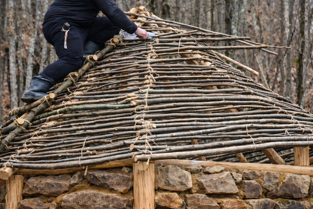 Después del montaje de la estructura de madera, el trabajo regresa a las piedras. Rocas medianas y grandes se apilan entre los troncos verticales, formando paredes gruesas que siguen el contorno circular de la base.