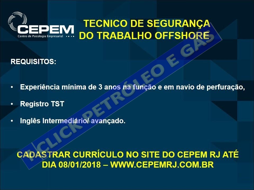 Técnicos en Seguridad en el Trabajo que tengan experiencia mínima de 3 años en la función en barcos de perforación, registro e inglés intermedio/avanzado son convocados por CEPEM. Es necesario entrar en el sitio de la empresa y registrarse. Vean la publicación aquí.
