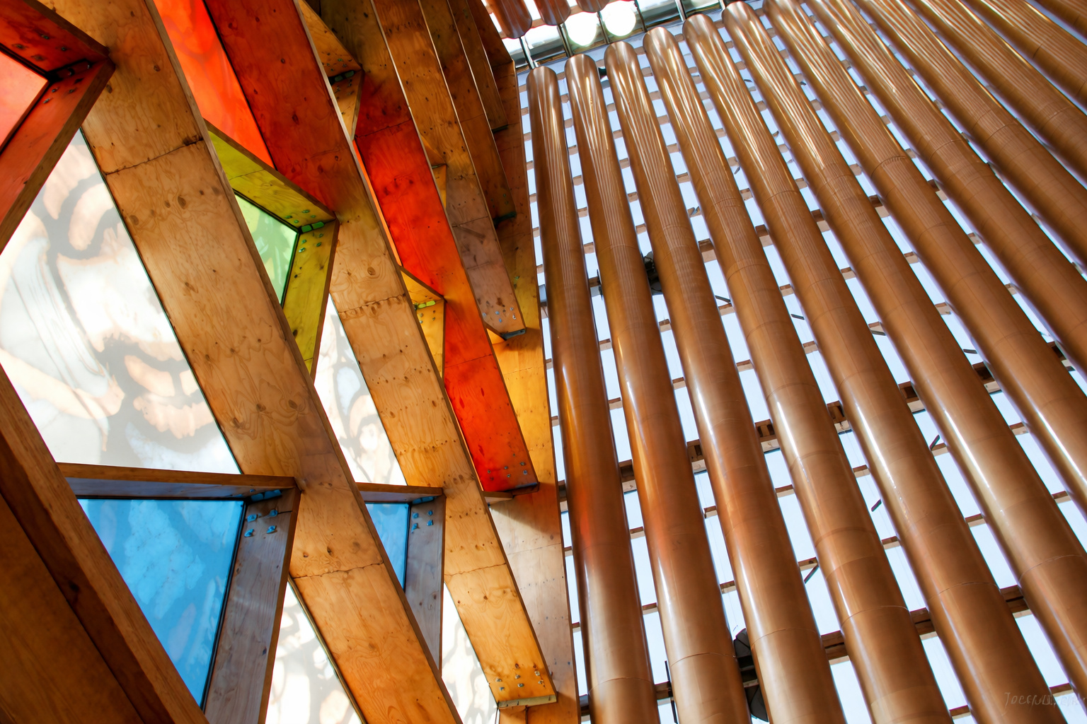 Los tubos están revestidos con poliuretano a prueba de agua y retardantes de fuego que Ban desarrolla desde 1986, años antes de que la sostenibilidad se convirtiera en palabra clave en la arquitectura. El recubrimiento protege el interior, mientras que los espacios de 5 centímetros entre los tubos permiten que la luz filtre hacia el interior de la catedral, creando una atmósfera única.