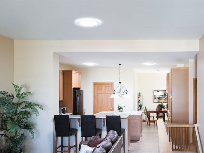 El sistema de iluminación natural Solatube captura la luz a través de un domo en el techo y la canaliza hacia abajo a través de un sistema reflector interno patentado. El tubo se coloca entre las vigas y se instala fácilmente sin modificaciones estructurales en su construcción.