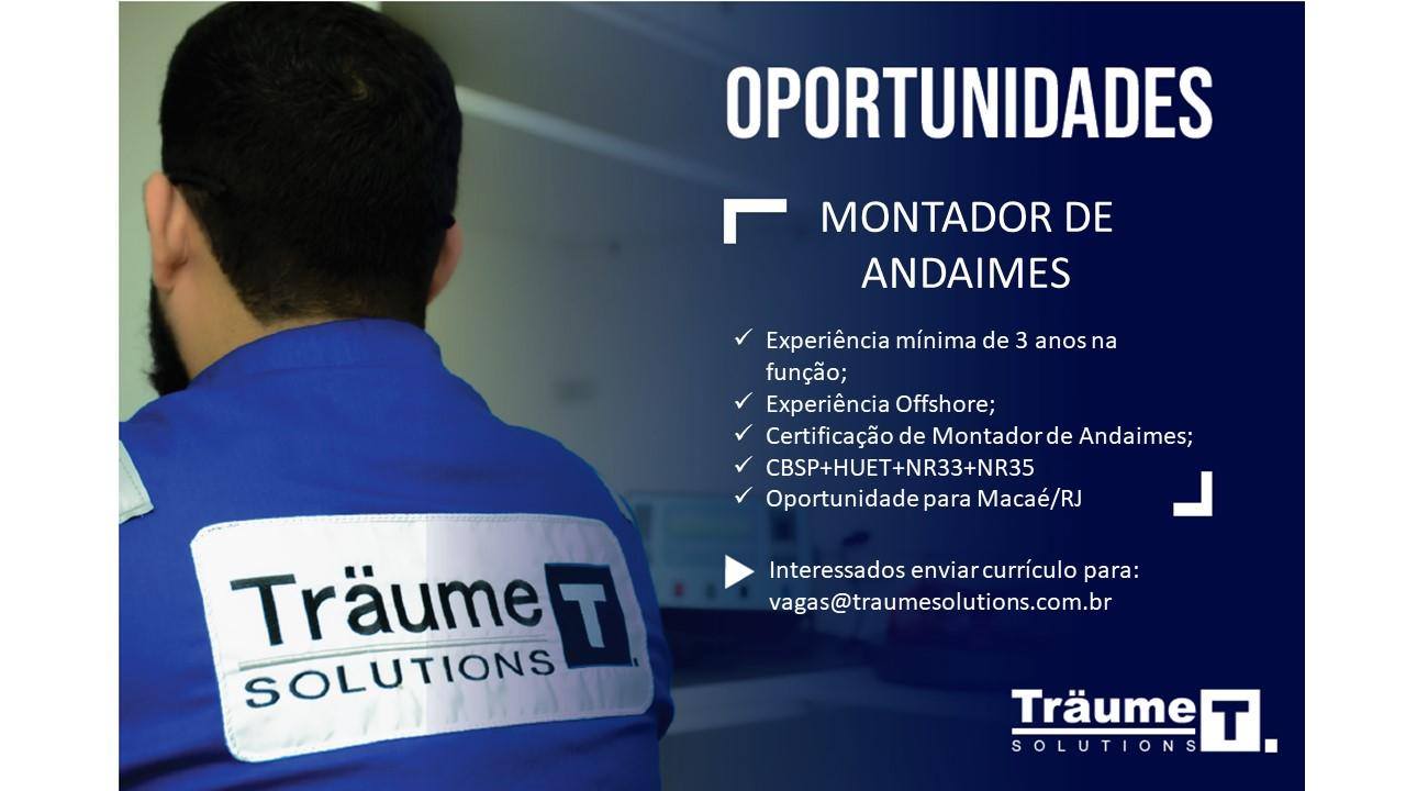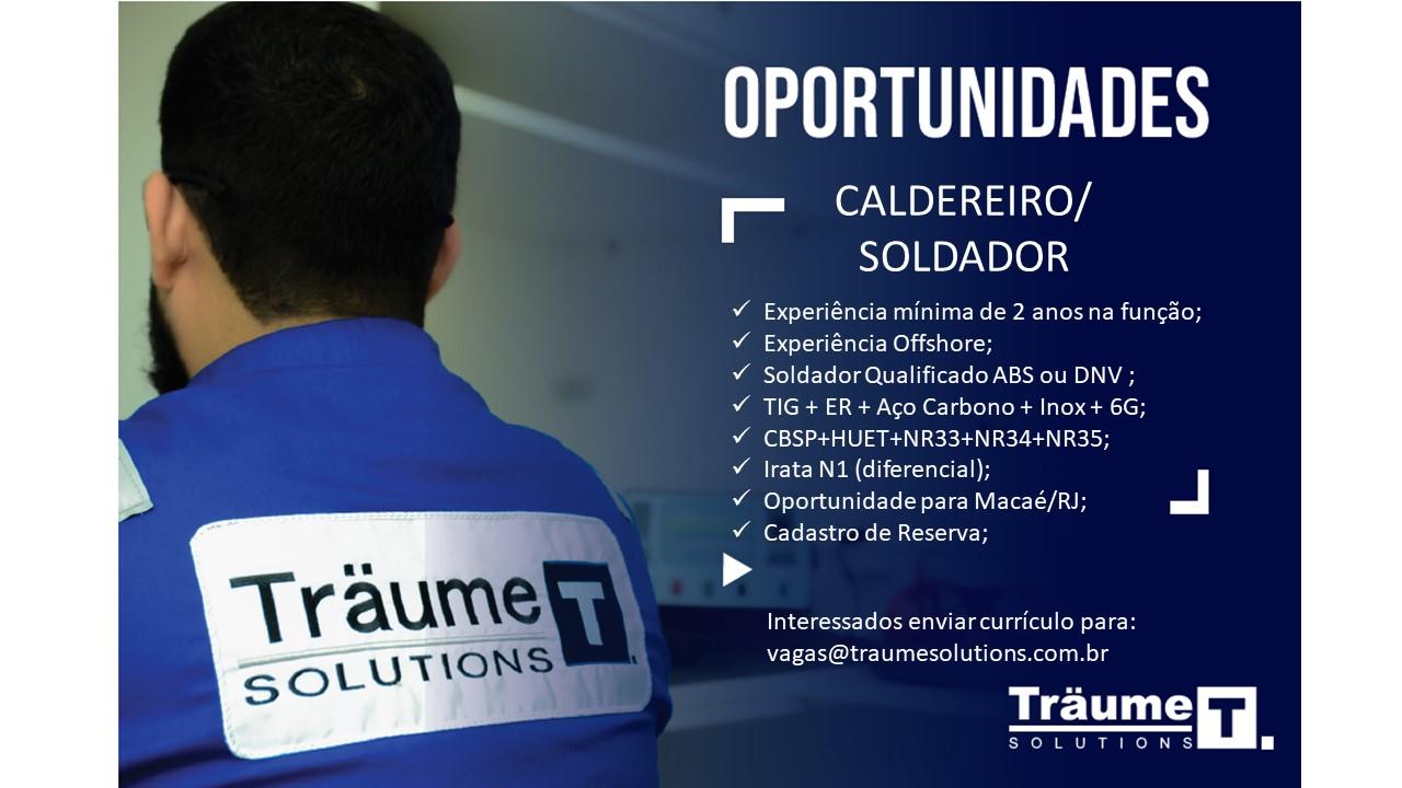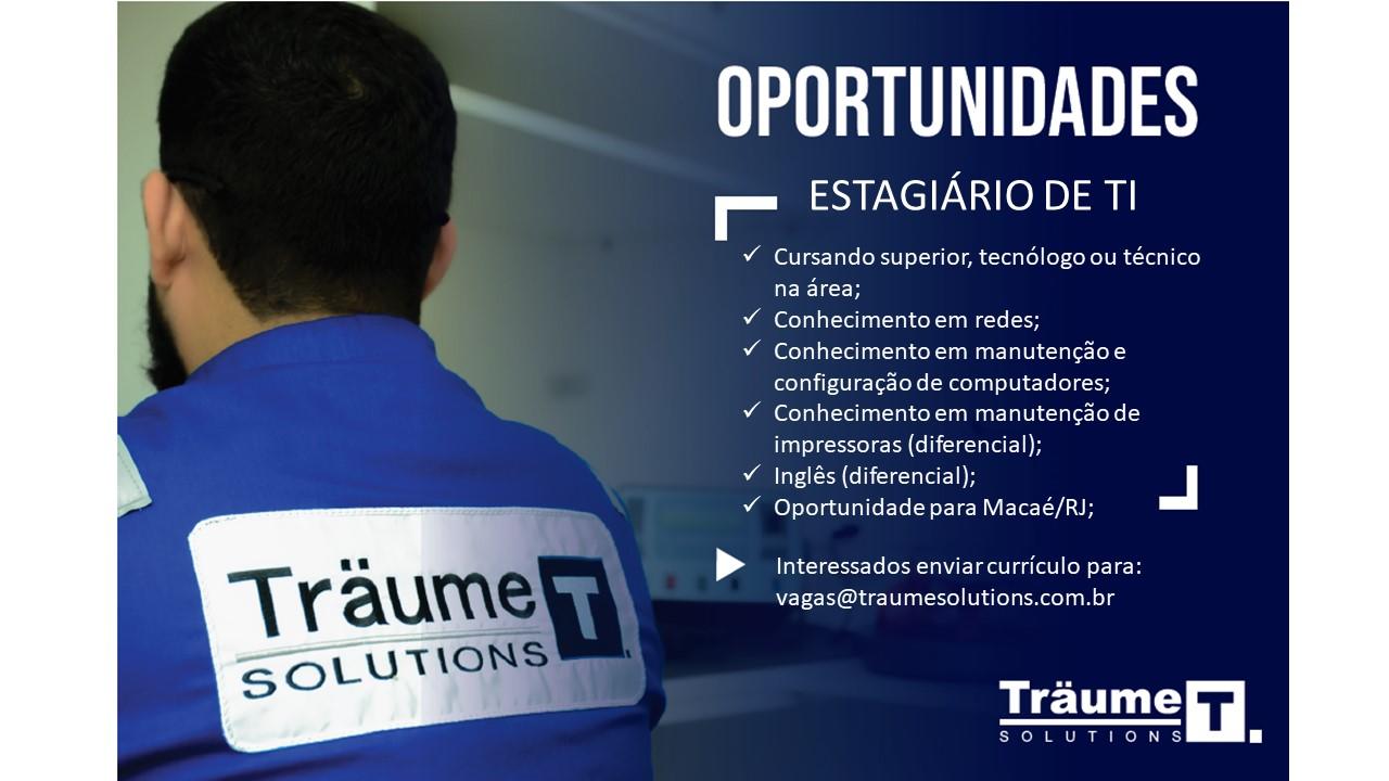 Cabe resaltar que todas estas oportunidades son para la ciudad de Macaé y registro de reserva, identifiquen en el campo del asunto el cargo al que se están postulando para facilitar a la empresa. El contacto es vagas@traumesolutions.com.br.