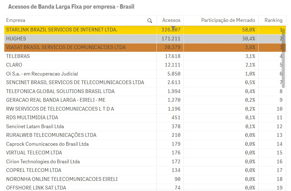 En tercer lugar, la estadounidense Viasat registró 20,3 mil accesos, mientras que Telebras aparece en cuarto lugar con 17,6 mil accesos. A pesar de la asociación entre estas dos empresas, Anatel contabiliza sus datos por separado.