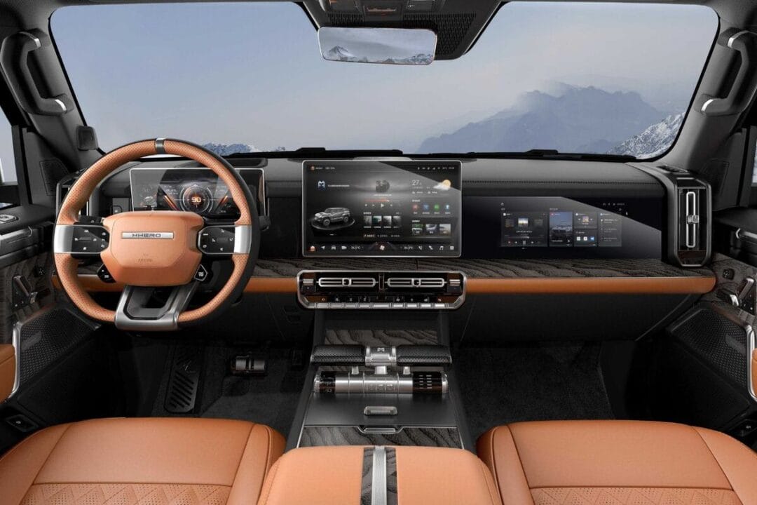 El Dongfeng M-Hero 917 se destaca por su diseño robusto e imponente, que parece esculpido directamente de una roca, con líneas exteriores marcantes y una estética dominada por formas geométricas y pliegues acentuados. Este SUV eléctrico va más allá de una simple apariencia robusta, incorporando características típicas de vehículos militares.