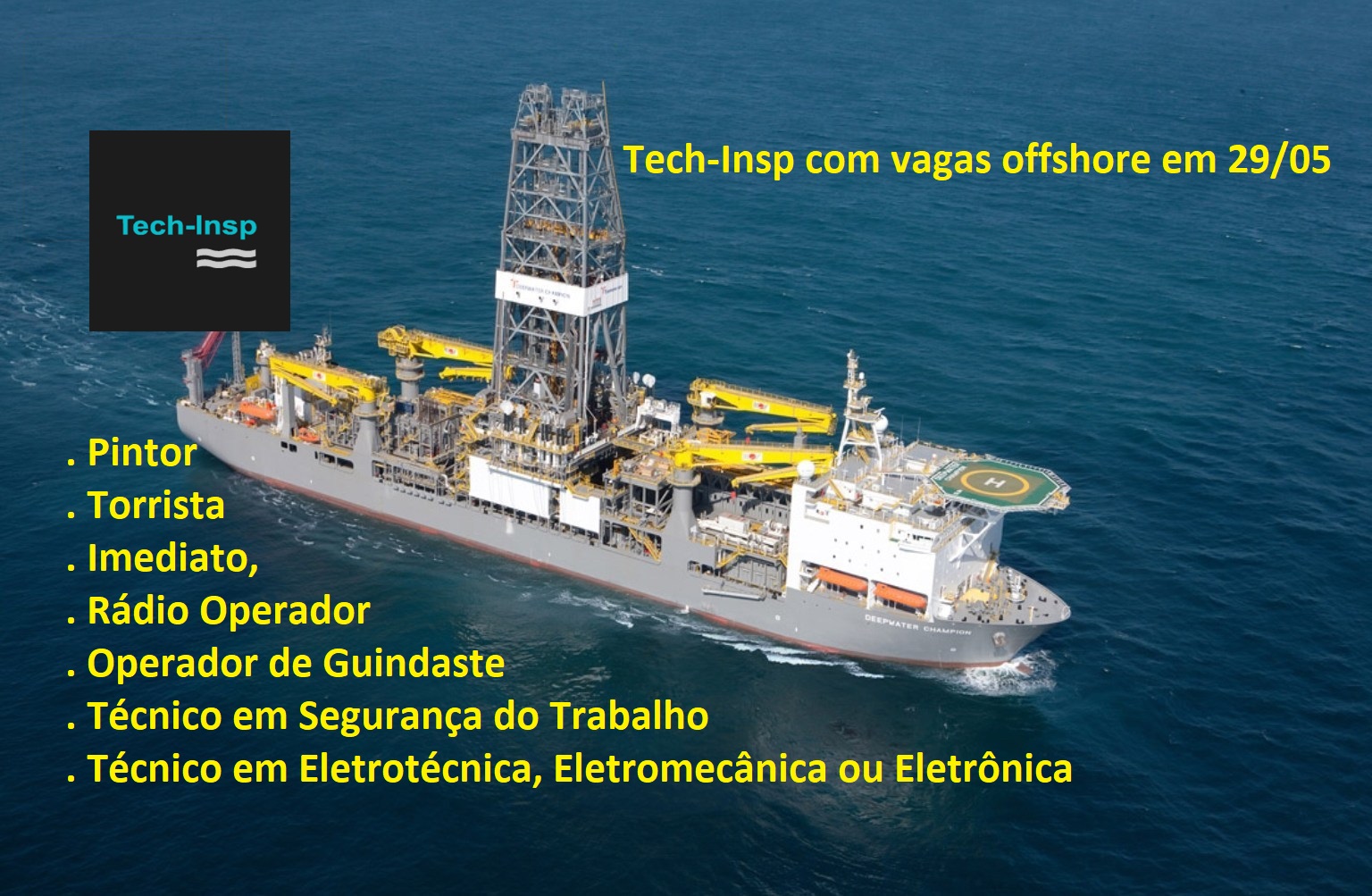 A Tech-Insp empresa especializada nas áreas de Petroquímica e Naval acaba de anunciar muitas vagas offshore para os cargos de Rádio Operador, Imediato, Pintor, Operador de Guindaste, Técnico em Eletrotécnica, Eletromecânica ou Eletrônica, Técnico em Segurança do Trabalho e Torrista, todo indica que essas vagas são para atender a demanda do seu primeiro contrato com a Petrobras que são de Apoio a Operação e Manutenção de Sondas de Perfuração da petroleira brasileira.