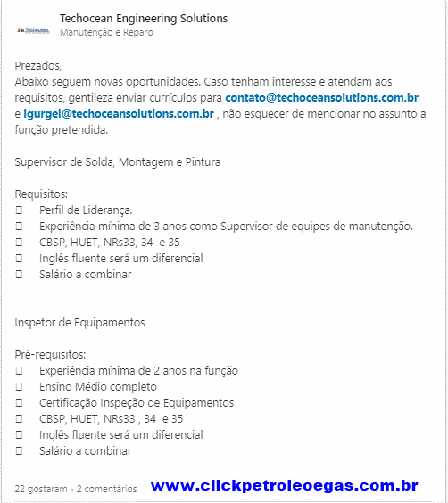 Technocean Acaba de Abrir Otro Proceso Selectivo a Pocos Días para el Área de Mantenimiento y Reparación Offshore. Los Requisitos de Formación y Experiencias Son los Más Variados, Así Que Tengan Atención y Responsabilidad al Postularse, Eviten Enviar Currículums de Forma Desenfrenada y Para Cargos Que No Tengan las Atribuciones, Esto Evitará Que la Empresa los Bloquee o Su Contacto Sea Detectado por los Sistemas Anti-Spam de la Empresa. A Continuación: