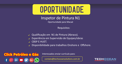 - Inspector de Pintura N1 – Calificación en Pintura Nivel 1 Abraco, experiencia en supervisión de equipos/obras, curso de CBSP/ Salvamento y HUET dentro de la validez, disponibilidad para trabajos tanto en tierra como en unidades offshore.