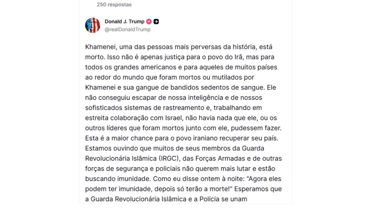 Además, el presidente calificó a Khamenei como “una de las personas más perversas de la historia”. Afirmó que la muerte representa justicia para el pueblo de Irán, para los grandes estadounidenses y para ciudadanos de varios países que habrían sido muertos o mutilados por Khamenei y su “banda de criminales sedientos de sangre”.