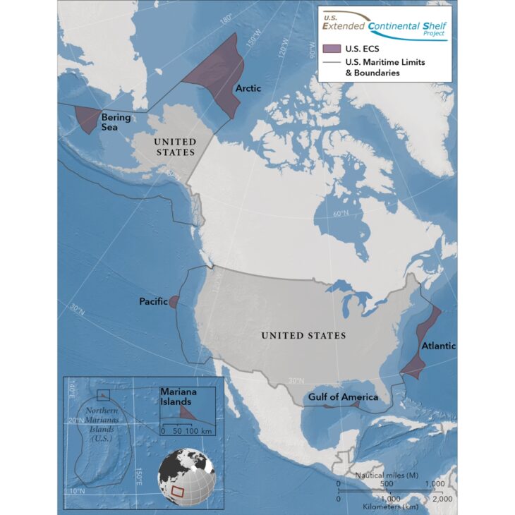 En el Ártico, los Estados Unidos realizaron la delimitación de una plataforma continental extendida de hasta 350 millas náuticas para garantizar derechos en el lecho y subsuelo, provocando tensión geopolítica y llamando la atención de Rusia, Canadá y Dinamarca