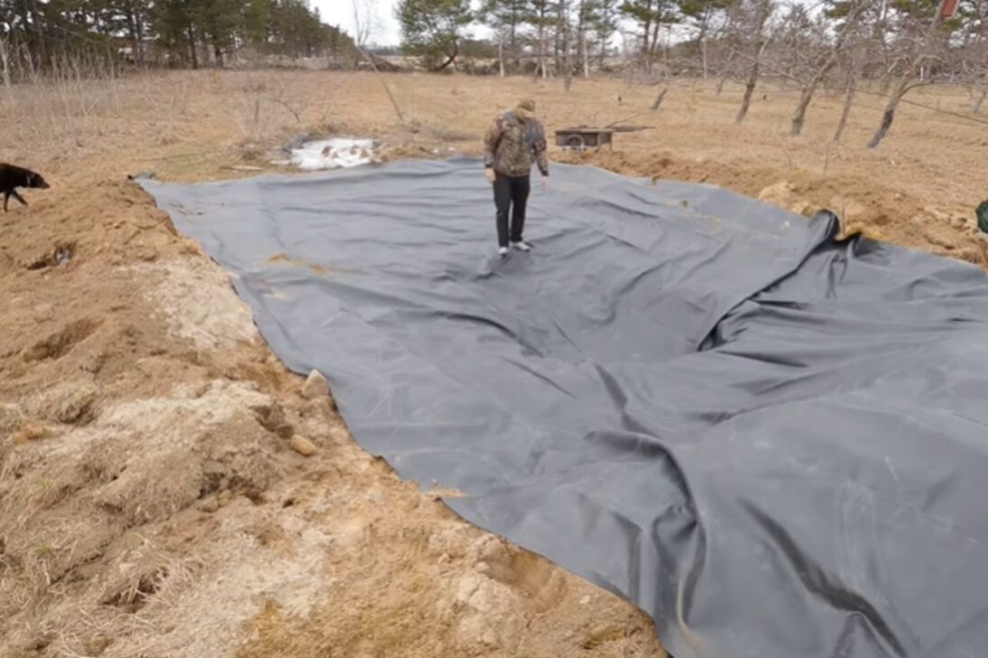Una vez que terminó de cavar el lago, se instaló la lona. Era la primera vez con un revestimiento de este tamaño, pero el material se colocó sin agujeros ni problemas graves.