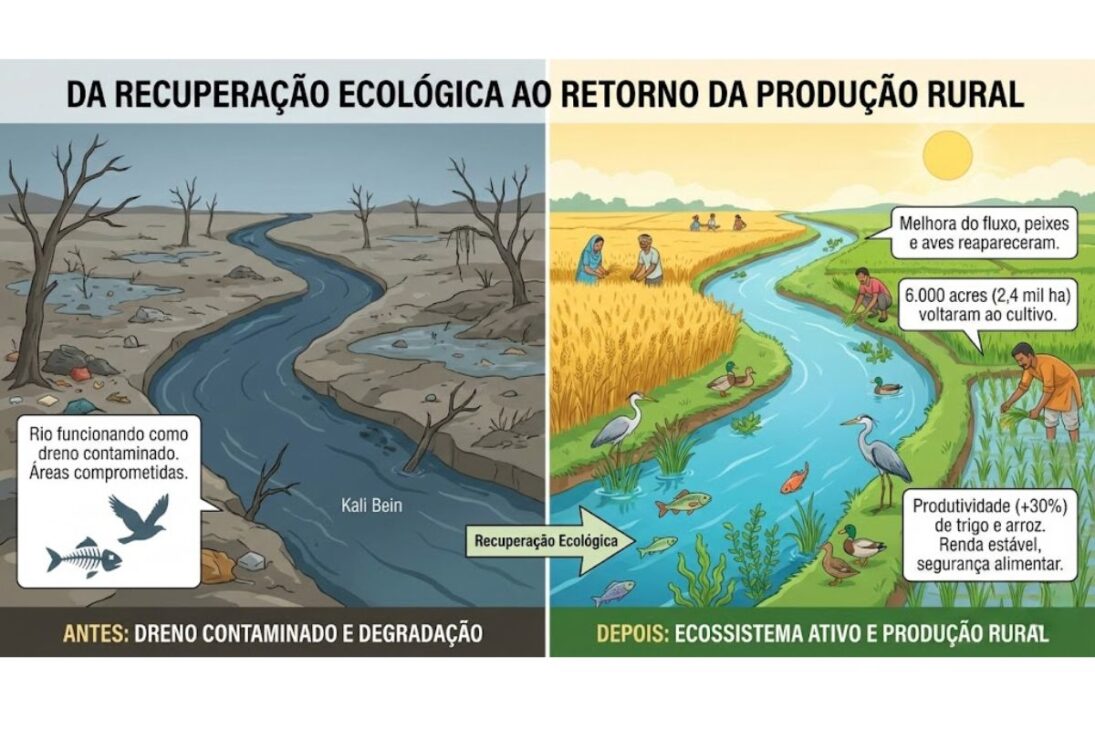 En Punjab, India, la recuperación de un río degradado por aguas residuales domésticas, residuos industriales y plantas invasoras avanzó sin financiación pública: 3.000 voluntarios limpiaron 160 km, abrieron canales, desviaron efluentes, vieron pozos volver después de cuatro décadas y recolocaron miles de hectáreas en el ciclo productivo local con impacto social duradero.