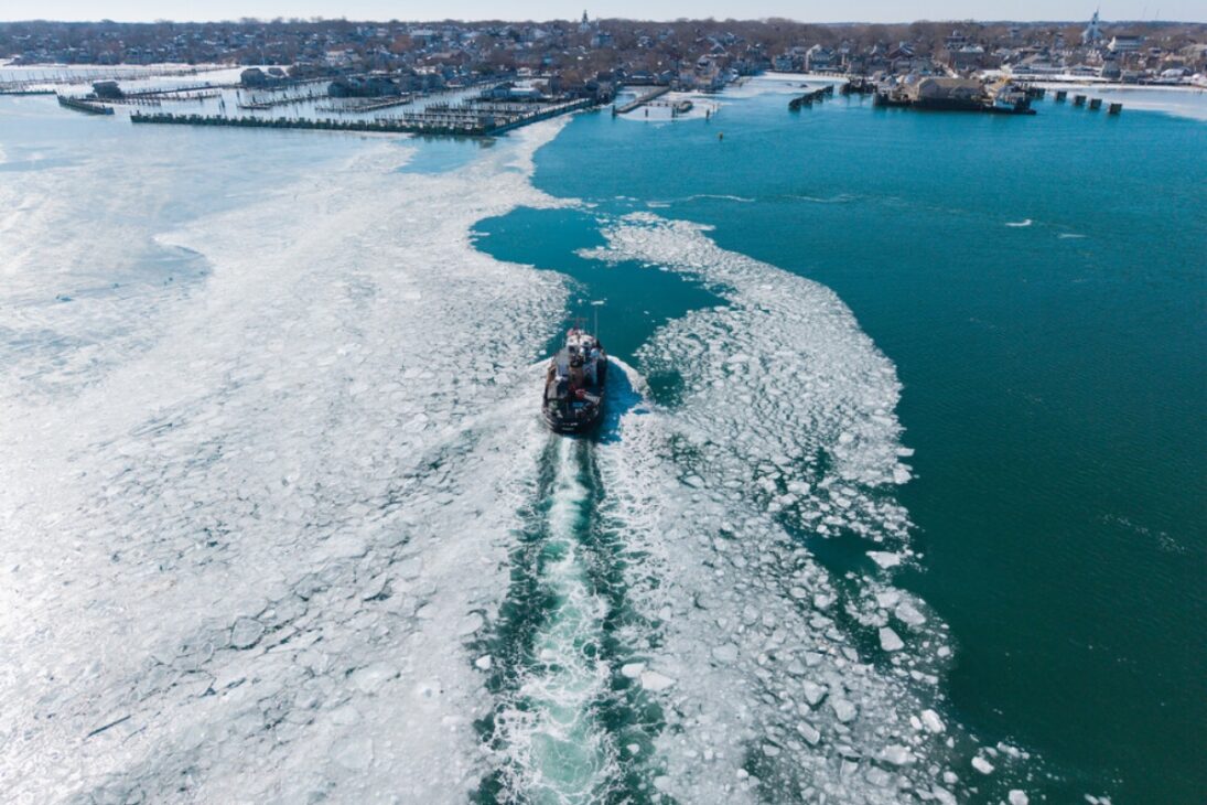 La ingeniería del Shackle le permite romper el hielo tanto con su casco reforzado como con su estela, demostrando su eficacia incluso después de décadas de servicio. El jueves, el barco cortó el hielo con facilidad cerca del Straight Wharf y la Marina de Nantucket, una imagen que se ha vuelto rara para los habitantes locales.