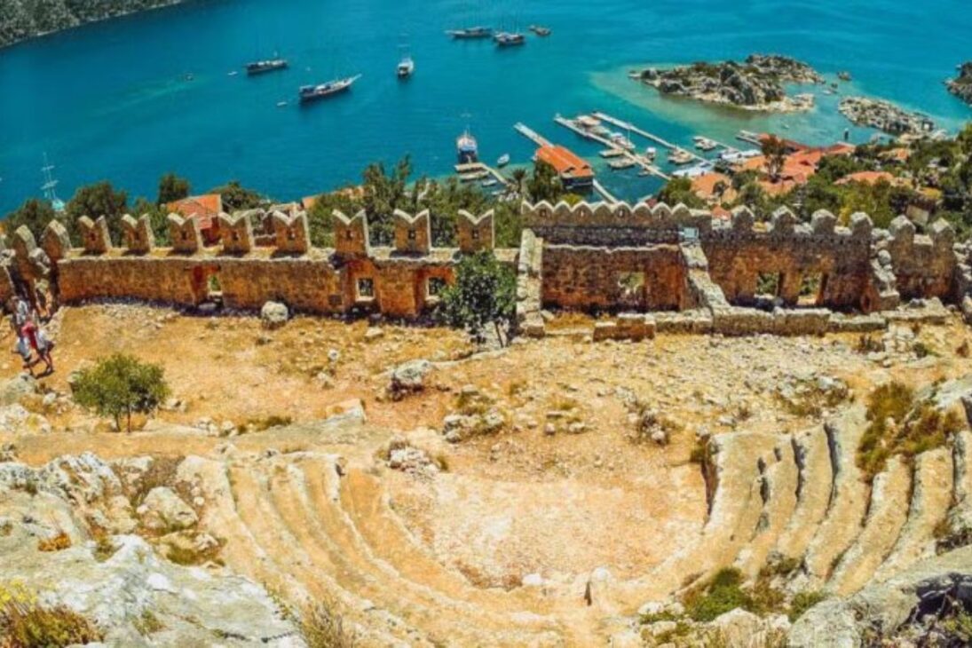 El escenario está dominado por una fortaleza del siglo IV a.C., construida para defender la ruta comercial contra piratas. En la cima, un teatro para 300 personas amplía la sensación de contraste: desde arriba, se puede imaginar la ciudad entera que el mar “engulló” y entender por qué ese punto era estratégico.