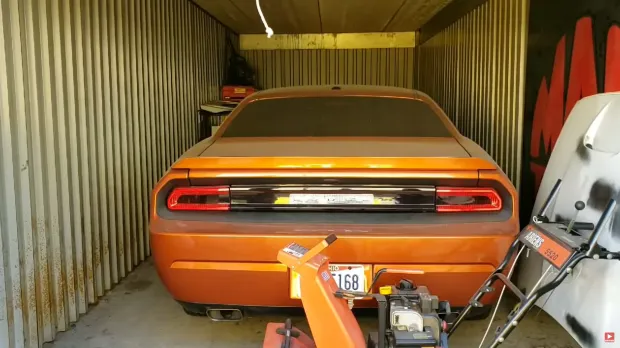Al abrir el depósito, el equipo quedó boquiabierto al encontrarse con un muscle car Dodge Charger naranja, en estado impecable, reposando en el medio del lugar.