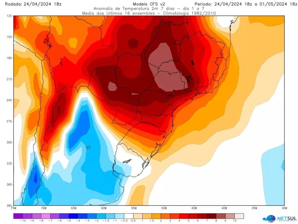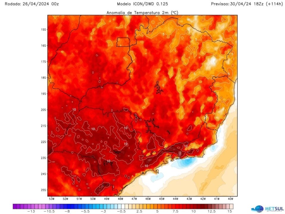 El Centro de Brasil está ante una condición climática extraordinaria, con una inminente ola de calor intensa. De acuerdo con el alerta emitida por la MetSul Meteorologia, las temperaturas proyectadas para finales de abril y principios de mayo, especialmente en las regiones Centro-Oeste y Sudeste, están previstas para alcanzar niveles históricos, muy por encima del estándar para esta época del año.