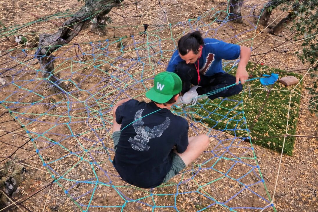 La construcción se llevó a cabo en etapas con Charlie, el especialista en tejer estas estructuras con cuerdas, con práctica inicial en estructuras más pequeñas y avance gradual hacia puntos más altos. Este progreso fue esencial para reducir el error humano.