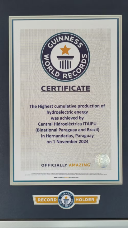 Este Logro Reafirma La Relevancia Global De La Usina. Durante La Ceremonia De Nombramiento, Realizada En El Hall Del Edificio De Producción, Una Jueza Del Guinness Book Entregó El Título Al Director General Brasileño, Enio Verri, Y Al Director Paraguayo, Justo Aricio Zacarías Irún.