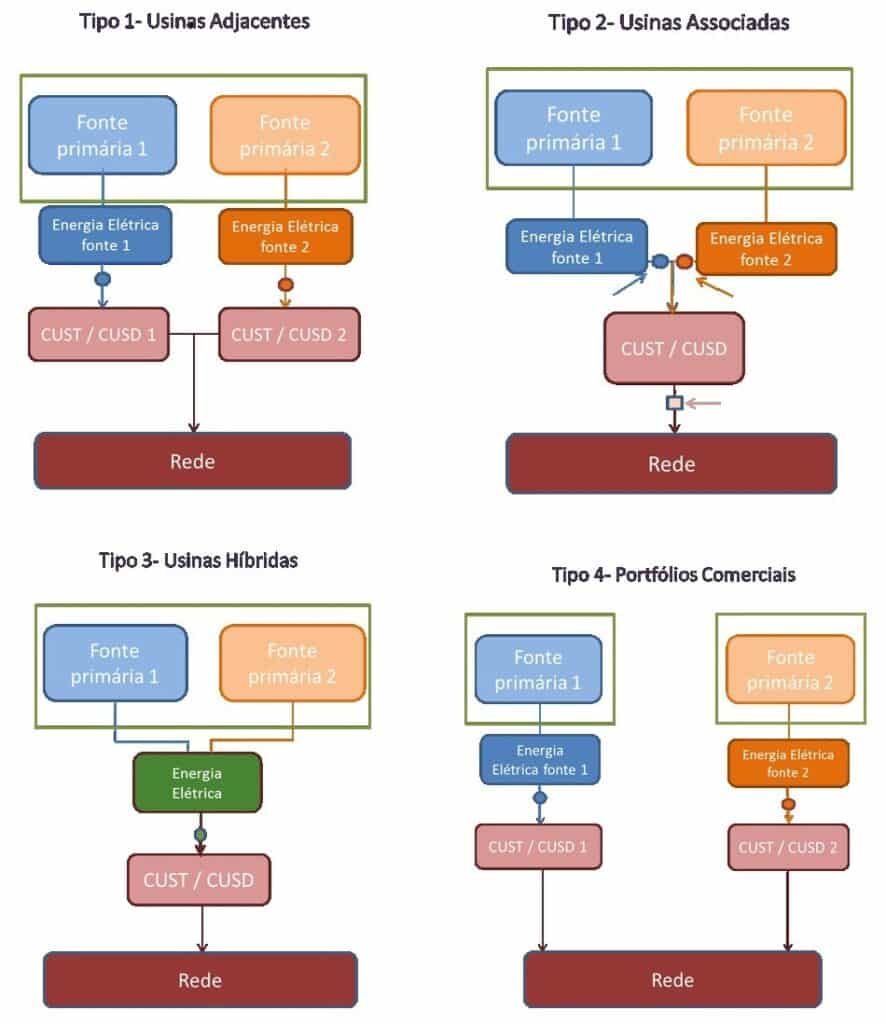 Dos o más plantas de fuentes energéticas distintas (hidroeléctrica y solar, por ejemplo), con características de producción complementaria y que, además de su proximidad, comparten físicamente y contractualmente la infraestructura de conexión de acceso a la red básica o red de distribución.