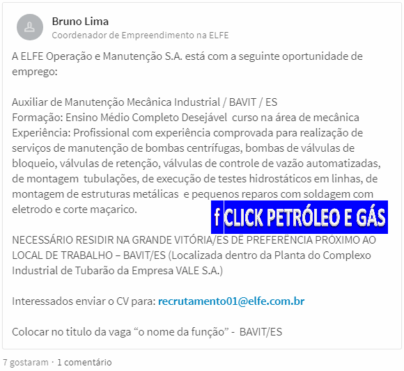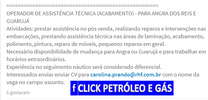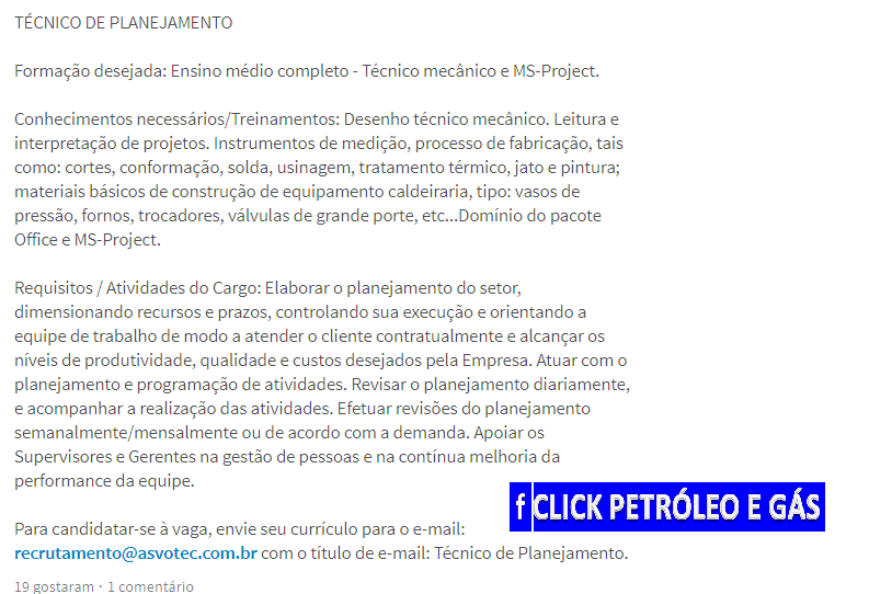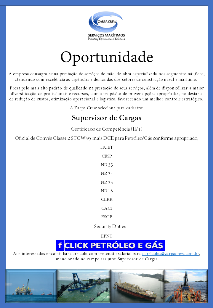 Click Petróleo y Gas pide encarecidamente a usted seguidor, que solo envíe su currículum si se ajusta a las atribuciones de las vacantes, pues las empresas tienen recursos para bloquear correos electrónicos de personas que siguen enviando CV’s que no correspondan a los criterios de las vacantes, además de hacer spam, interrumpiendo los procesos de selección. Tenga paciencia porque su turno está llegando, solo debe seguir nuestras publicaciones. Justo abajo en el SlideShow, vean los correos electrónicos y los contactos de las empresas en las fotos.