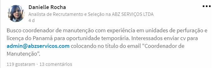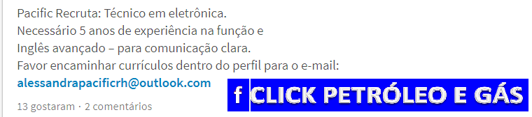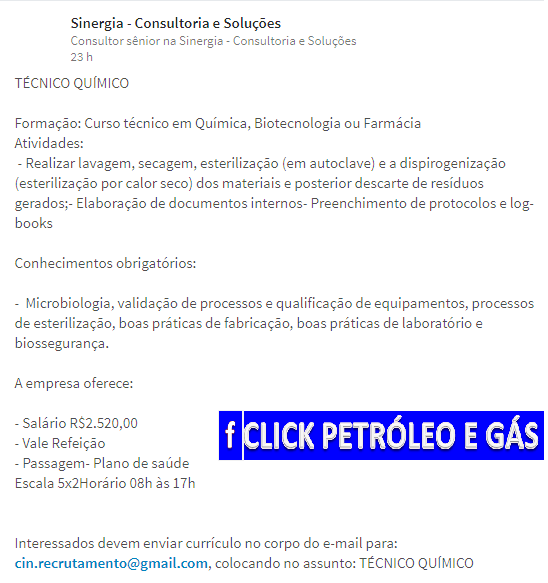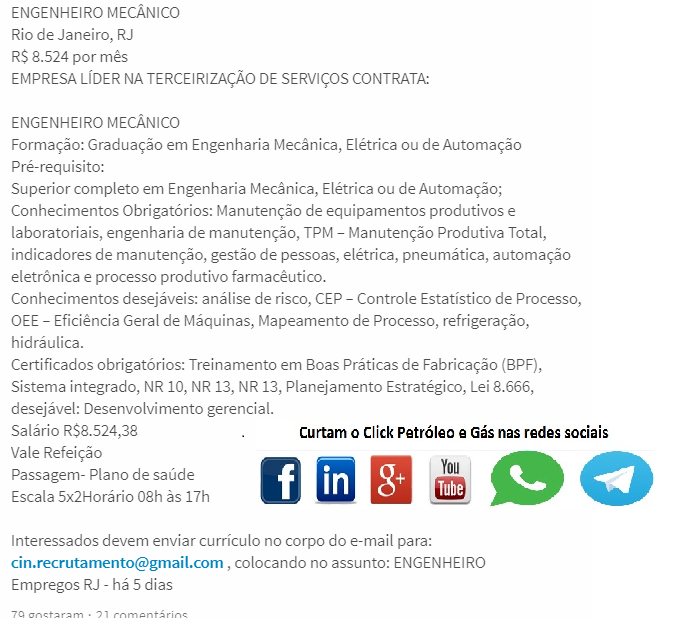 Click Petróleo y Gas pide encarecidamente a usted seguidor, que solo envíe su currículum si se ajusta a las atribuciones de las vacantes, pues las empresas tienen recursos para bloquear correos electrónicos de personas que siguen enviando CV’s que no correspondan a los criterios de las vacantes, además de hacer spam, interrumpiendo los procesos de selección. Tenga paciencia porque su turno está llegando, solo debe seguir nuestras publicaciones. Justo abajo en el SlideShow, vean los correos electrónicos y los contactos de las empresas en las fotos.