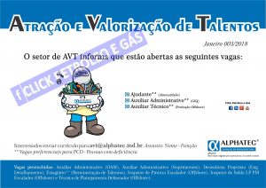 [supsystic-social-sharing id=’1′]Vacantes De Empleo Acaban De Ser Anunciadas Por Alphatec Engenharia. Como Bien Saben, Es Especialista En Servicios De Mantenimiento En La Modalidad Offshore Y Posee Algunos Buenos Contratos Con Petrobras Para La Prestación De Servicios En La Cuenca De Campos Actualmente. Recibimos Una Notificación, Hace Poco, Que Abrió Procesos Selectivos Para Auxiliares En La Empresa, Algunos Son En Mar Y Otros En La Propia Base De La Empresa.