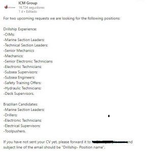 Aunque el reclutamiento sea internacional, las actividades offshore se llevarán a cabo en Brasil. Los interesados y dentro de las funciones, podrán enviar sus currículums al correo electrónico hr@icmpeople.com EN INGLÉS, indicando el nombre en el título del cargo del mensaje «Drillship – Position Name». No tiene sentido usar Google Traductor, en el momento de la entrevista no tendrán este recurso.