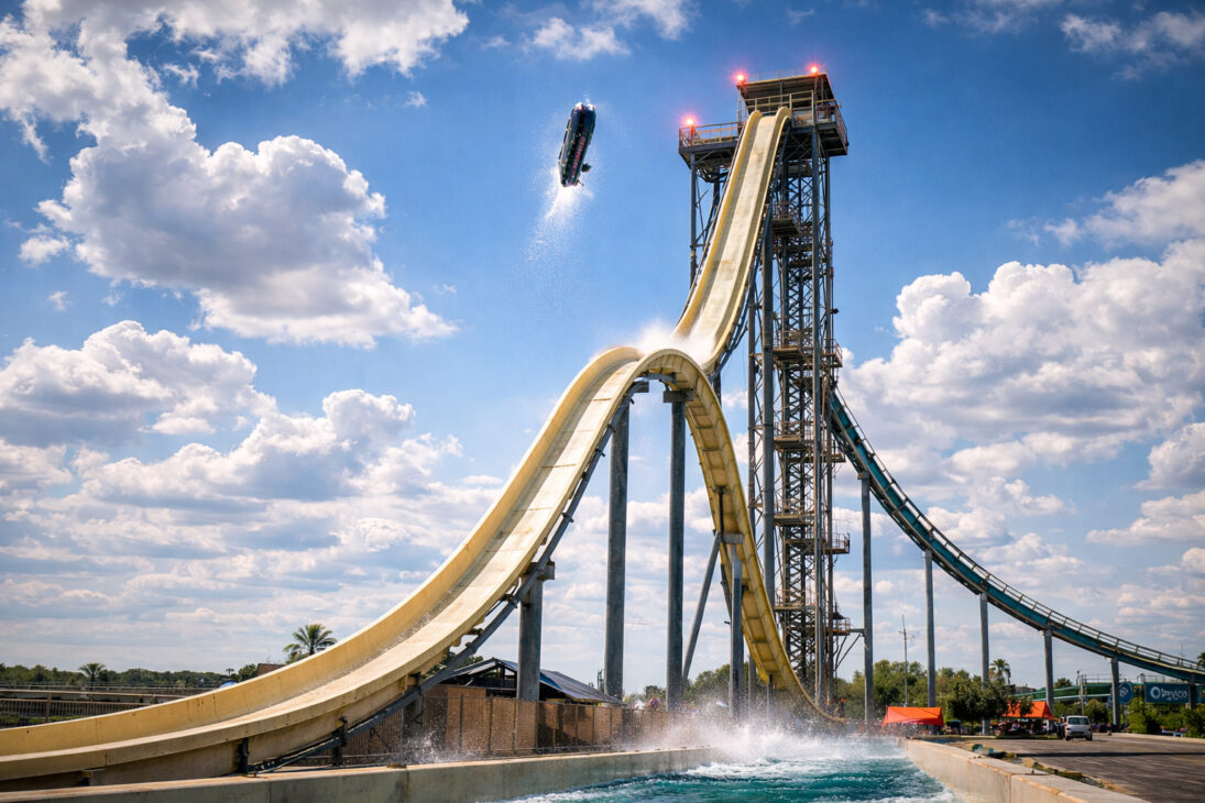 La promesa era un descenso casi vertical, velocidad absurda, luego una segunda elevación capaz de entregar la sensación de gravedad cero. Para quienes disfrutan de récords, ese era un gran nombre. Para quienes se encargan de la seguridad, se trataba de un proyecto que exigía un margen de error generoso y control técnico estricto.