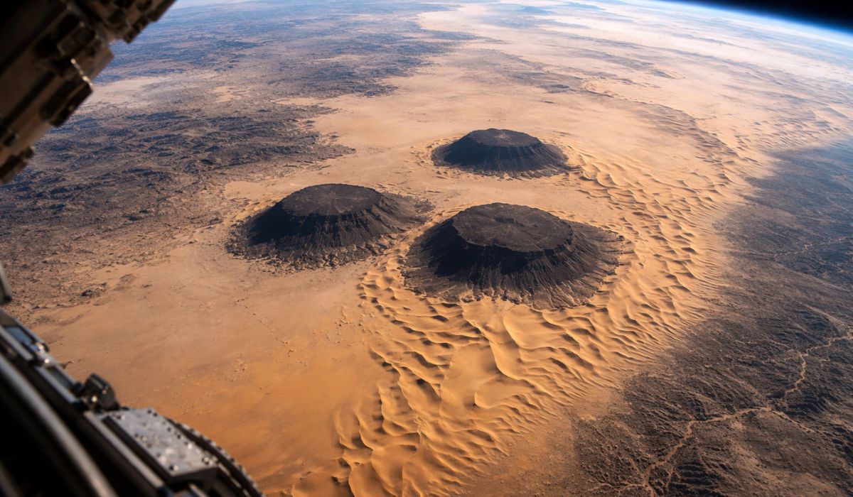Visto desde el espacio, un trío de mesas negras formadas hace cientos de millones de años y remanentes de la era Paleozoica creó raras dunas en el corazón del Sahara y una extraña zona sin arena que intriga hasta hoy a los científicos, transformando el desierto en un escenario casi marciano.