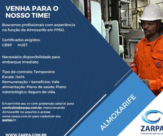 Zarpa Tiene Vacantes De Empleo Destinadas Al Ámbito Onshore Y Offshore En Todo El Estado De Río de Janeiro (RJ). La Candidatura Para El Proceso Selectivo Se Realiza A Través Del Correo Electrónico currículos@zarpa.com.br. Las Vacantes Se Compartieron A Través Del Perfil Privado De Una De Las Reclutadoras.